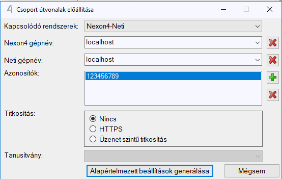 Itt válasszuk ki a Kapcsolódó rendszerek közül a Nexon4-Neti tételt, és adjuk meg a Nexon4 és Neti gépek neveit, majd az Alapértelmetett beállítások generálása gombra kattintva hozzuk létre a beállításokat.