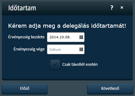 Amennyiben a Csak távollét esetén jelölő bepipálásra kerül, csak azokon a napokon kerül sor a jogosultság-delegálásra, amikorra a delegáló: