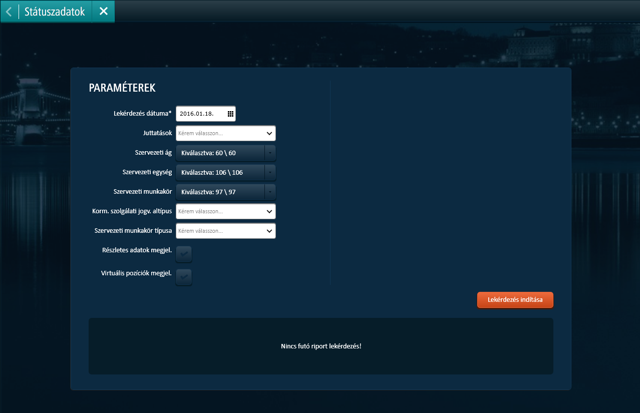 A lekérdezés a kiválasztott szervezeti egységek alapján összegyűjti az érintett státuszokat (pozíciókat), amelyek a szervezeti struktúrában érvényesek a lekérdezés pillanatában.