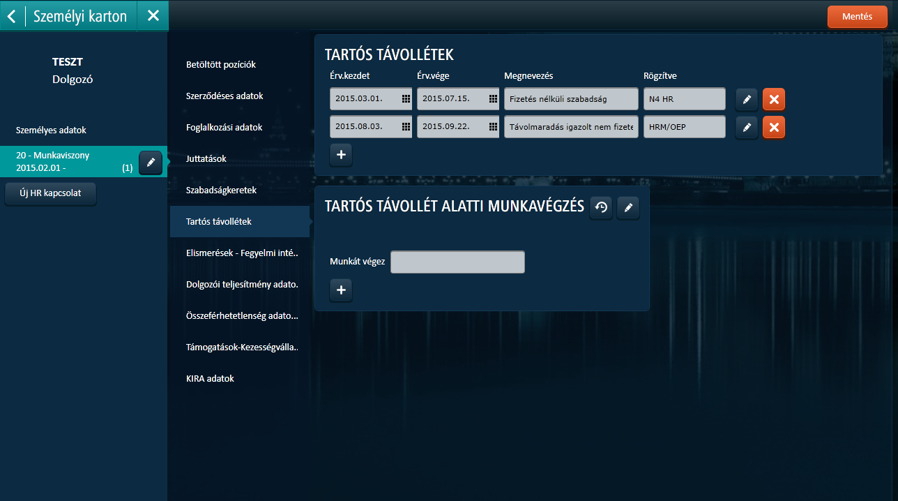 Az alábbi adatkörök és adatok tarthatóak karban a Munkavégzésre irányuló típusú HR kapcsolatra vonatkozóan (lásd "Munkavégzésre irányuló HR kapcsolatok" beállítást).