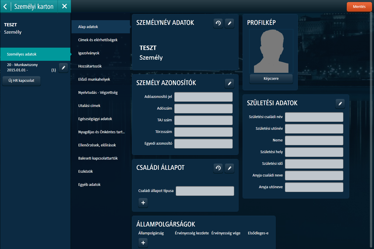 A képernyő bal oldalán található "Személy adatok" menüre kattintva a személy adatkörei tekinthetőek meg és tarthatóak karban.