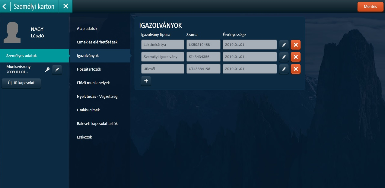 Közvetlenül a "Személy adatok" menü alatti HR kapcsolat menüre kattintva, a kiválasztott HR kapcsolatra vonatkozó adatok tekinthetőek meg és tarthatóak karban.