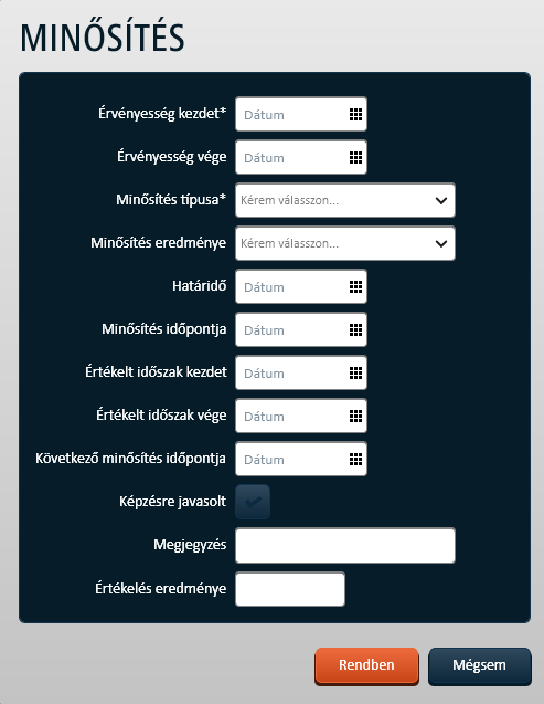 Az alábbi Minősítés képernyőn végezheti el az adatkörre vonatkozó karbantartási feladatait a felhasználó: